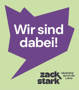 Rauchfrei durch die Lehre mit «zackstark»: Wir ermutigen unsere Lernenden, nikotinfrei zu bleiben. Diese verpflichten sich (freiwillig), während der gesamten Lehre keine Tabak- und Nikotinprodukte zu konsumieren. Wir als Lehrbetrieb unterstützen und motivieren die Lernenden mit Gesprächen und Belohnungen und finden dies, wie der Projekttitel sagt, zackstark. Übrigens: zweimal 20 Minuten pro Tag geniessen unsere Auszubildenden eine bezahlte Pause, am besten ohne Glimmstengel...