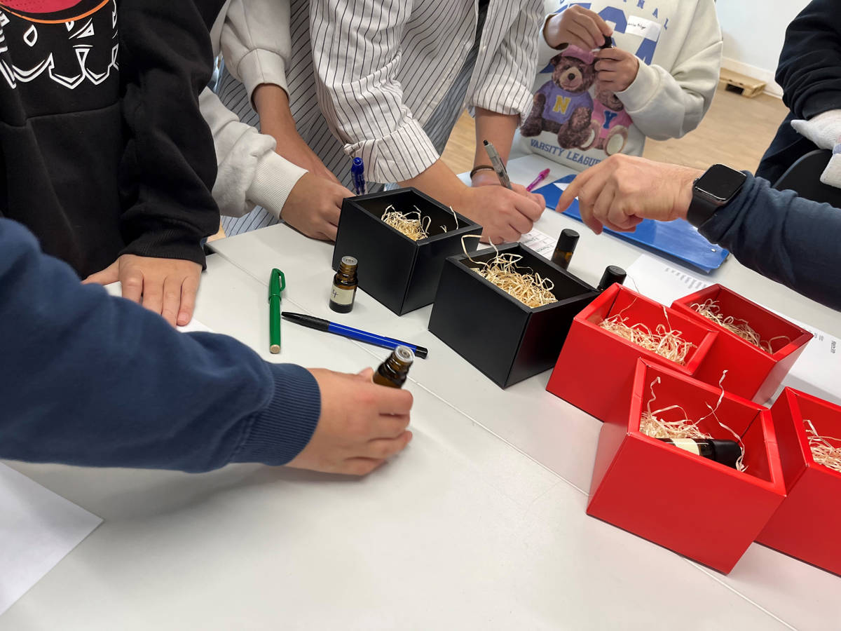 Nach ein paar Fakten zu TRANSfair ging es auf einen Rundgang durchs Lager und in die Produktion, wo gerade Aromasprays abgefüllt wurden. Bei einem Riechtest mit ätherischen Ölen errieten die Mädchen und Buben Lavendel, Thymian oder Zitrusgemisch und kennen nun den Duft der Weisstanne. Gestärkt mit einem Znüni-Schoggigipfel schlenderten die Kinder zwischen Regalen hindurch und suchten Kneipp-Produkte und Weihnachtskarten zusammen für den Postversand.