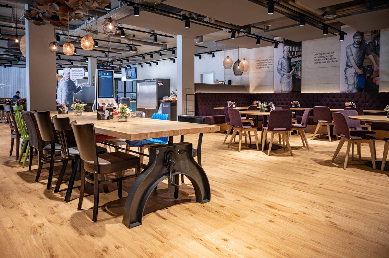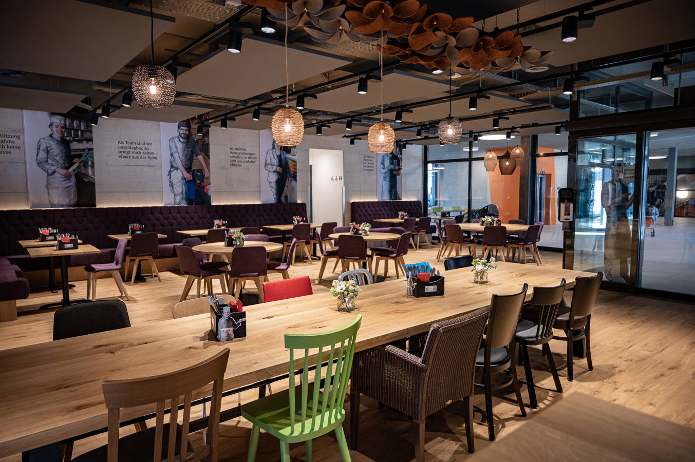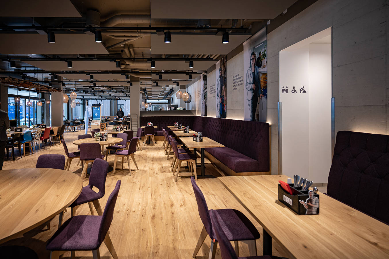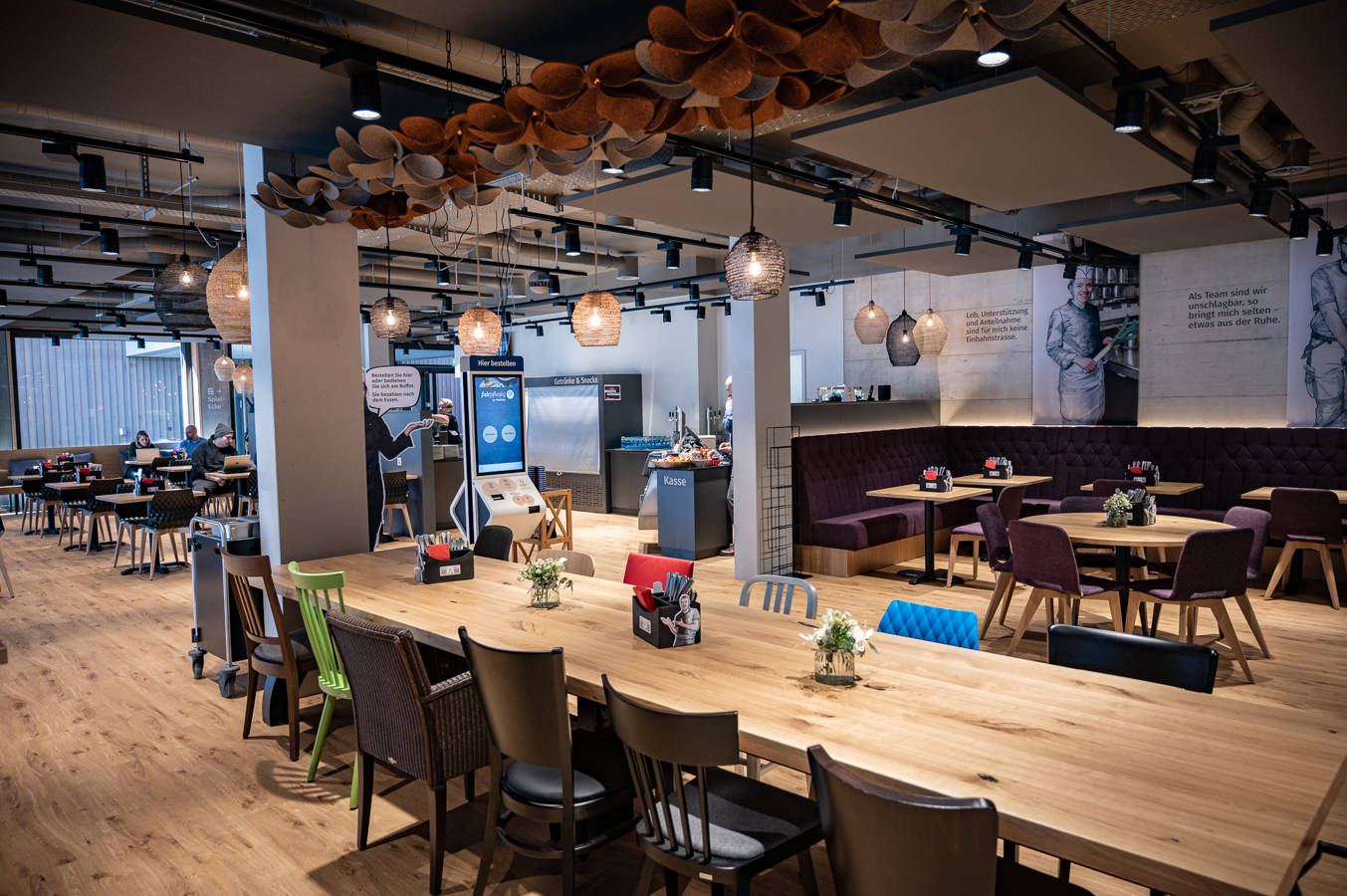 Das Restaurant verfügt über 130 Sitzplätze im Innenbereich sowie eine überdachte Terrasse mit Platz für weitere 50 Gäste. Wer auf dem Sprung ist, kann sein Menu als Take-Away mitnehmen. Die Kinderspielecke wird mit einer grossen Kreidewand überraschen. Ob herkömmlich oder modern, unser neues Bestell- und Bezahlkonzept bedient beides.